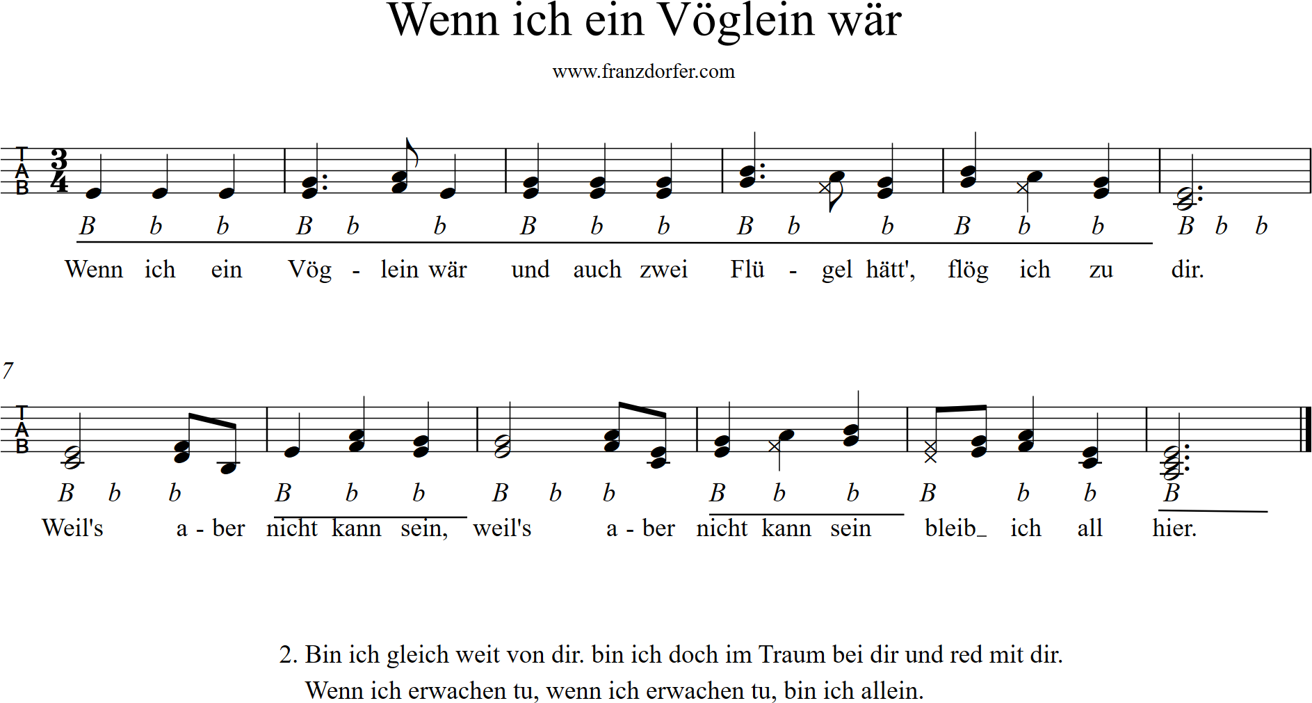 Wenn ich ein Vöglein wär - Noten, Liedtext, MIDI, Akkorde