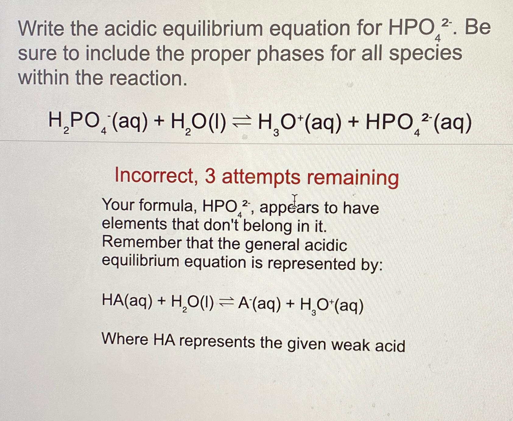 Solved Write the acidic equilibrium equation for HPO42-. Be | Chegg.com