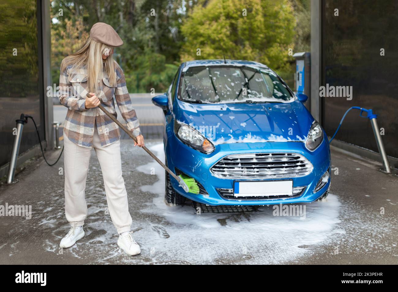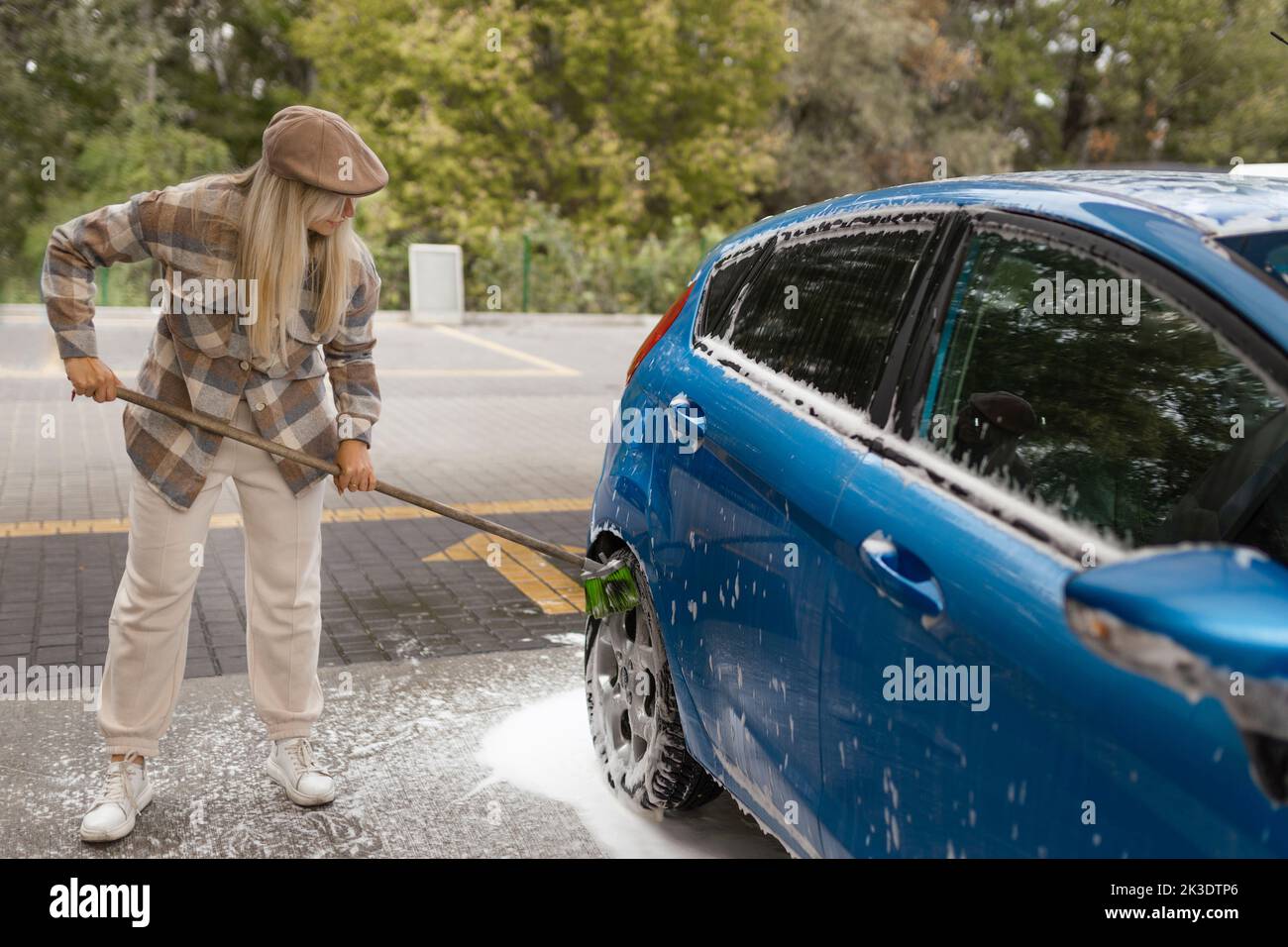 the women herself at the car wash washes the car with a brush Stock