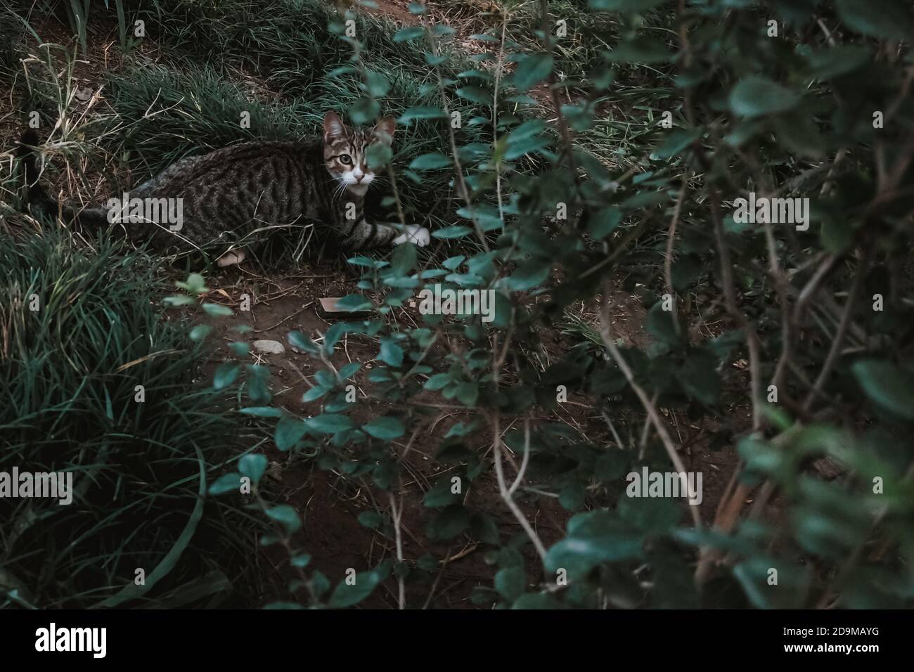 Cute stray cat on a hunt in the garden. Hiding in grass with camouflage